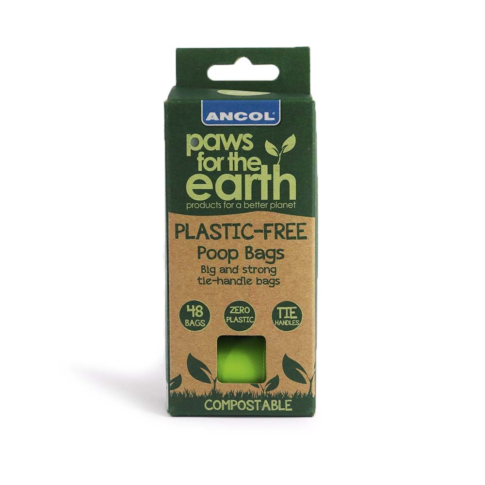 Ancol Paws for the Earth Plastic Free Poo Bags. These waste bags contain zero plastic so while it feels and looks like plastic it is made from compostable vegetable extracts. These bags are thick strong and waterproof but can biodegrade entirely. They are home-compostable and If a bag is inadvertently left in the open environment it will soon degrade and not pose a risk to wildlife or waterways.